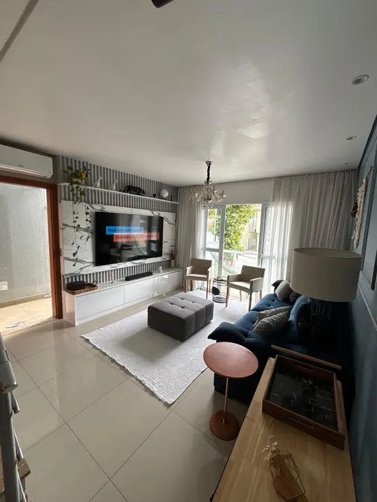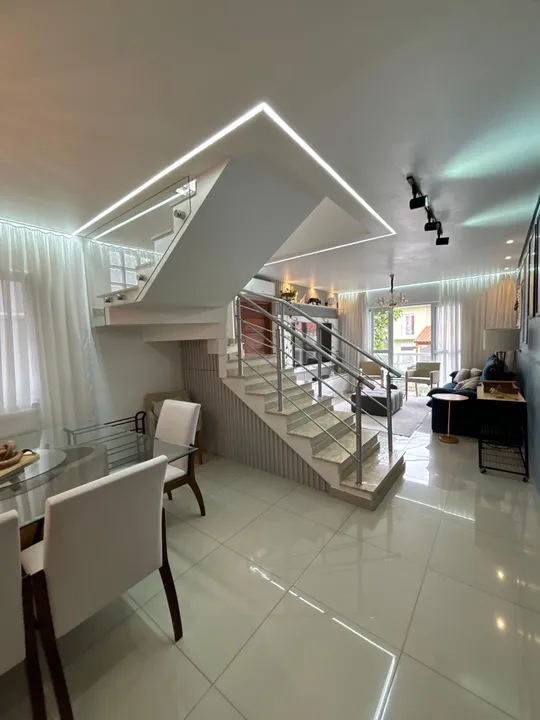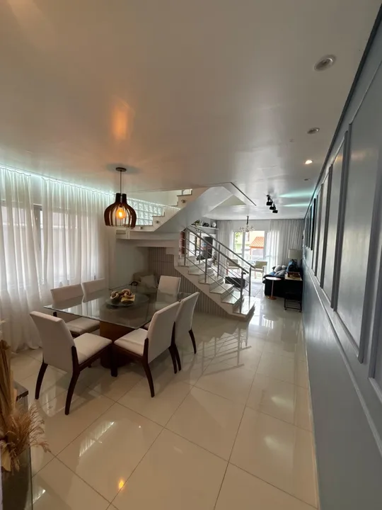 Sala: Ampla sala de estar com painel ripado para TV, ar condicionado inverter, spots de LED e lustre, além de uma sala de jantar com papel de parede.