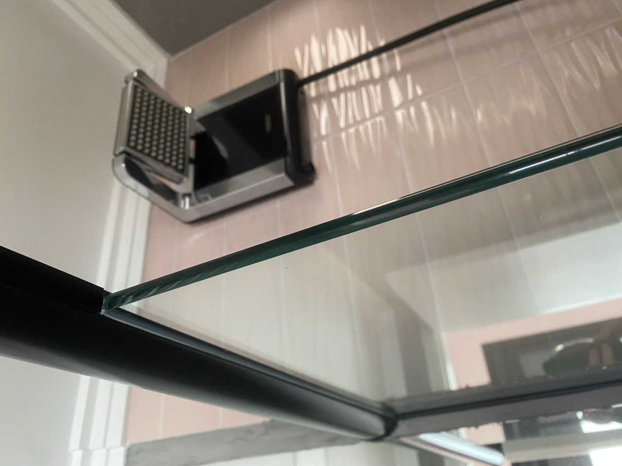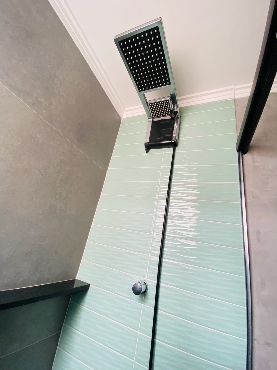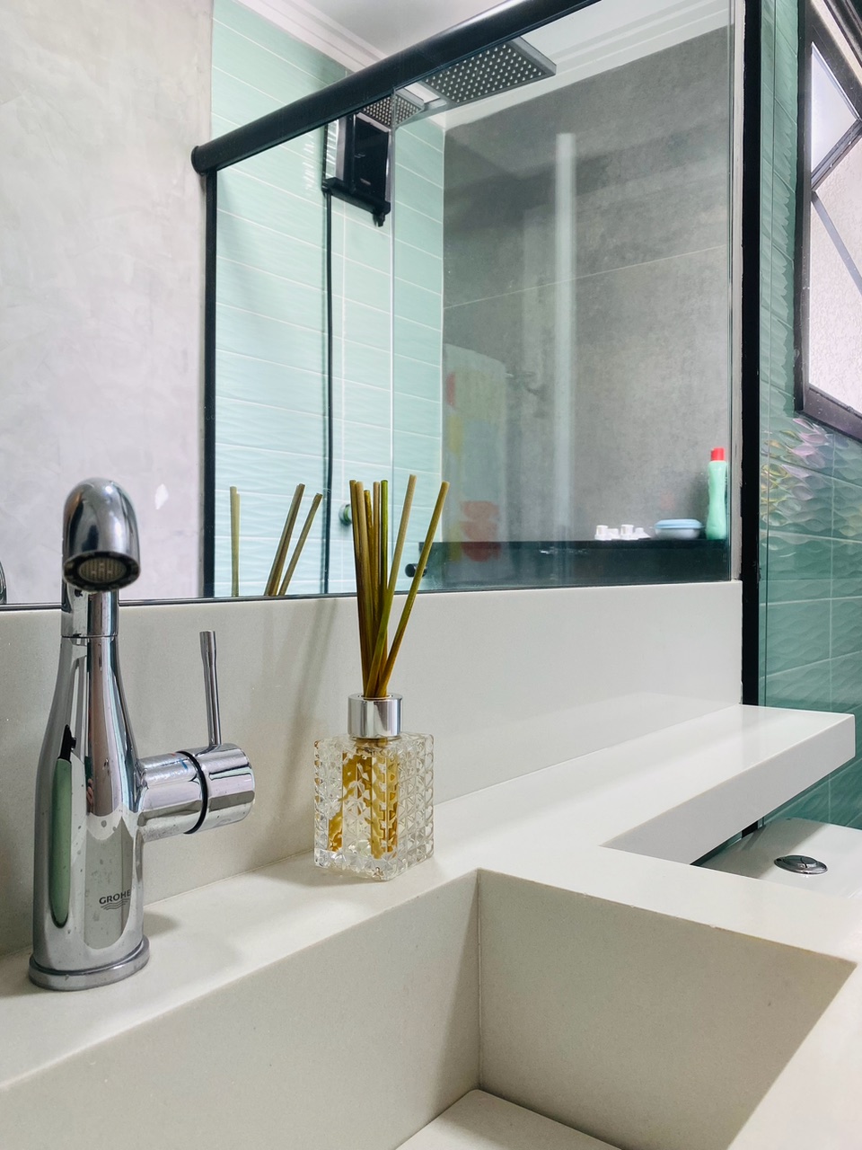 Todos os banheiros com Pias esculpidas no Silestone Branco e Torneiras Alemãs da marca Grohe com misturadores de água quente e fria, Chuveiros Lorenzetti Acqua Duo e Acqua Ultra, Gabinetes em MDF, Box de Vidro nos 3 Banheiros, Escada em Granito na Pedra São Gabriel preta como parapeito de Vidro 8mm.